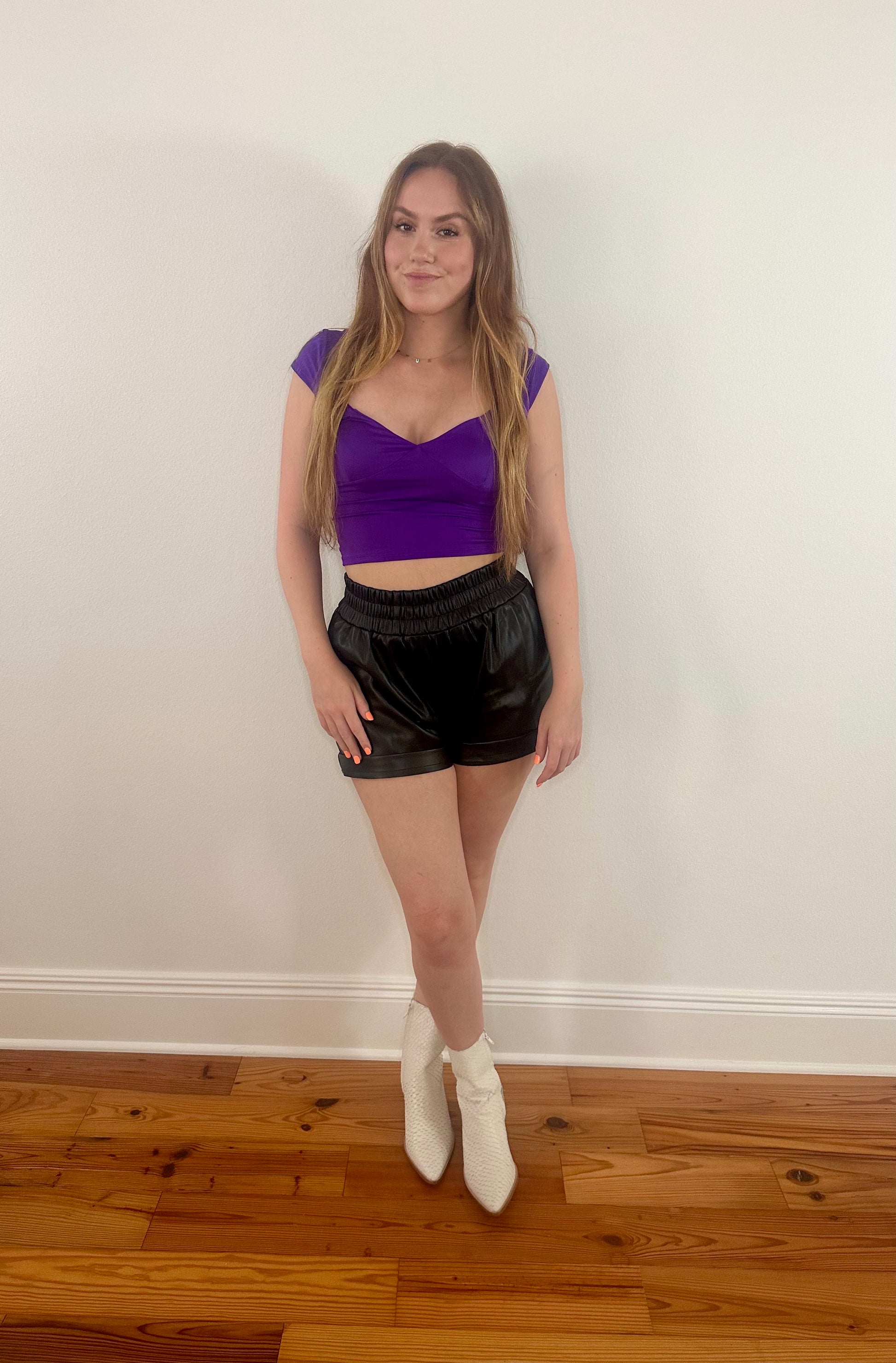 Show off your team spirit in style with our Purple Cap Sleeve Top! This fitted top features short cap sleeves and a flattering V-neckline for a sleek, feminine look. The subtle seam detailing adds an extra touch of sophistication, making it perfect for pairing with your favorite jeans or skirt. Whether you're cheering from the stands or hitting the after-party, this top is a gameday must-have for looking effortlessly chic!